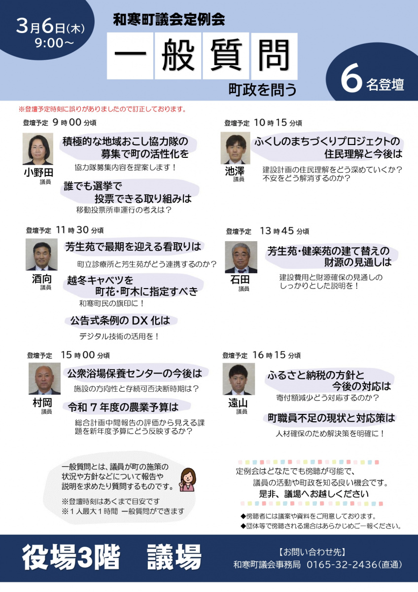 3月6日(木) 午前9時00分から【一般質問】
