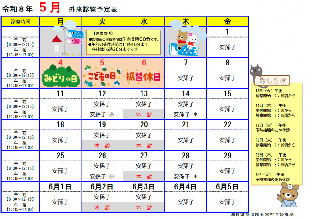 町立診療所(令和8年)5月外来診察予定表を更新しました。